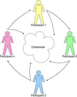 Then it is collated, summarized, and the most common solutions (say top 3 most common answers) are selected, and sent for further selection in a second round. In each round, the solutions get refined, and the least popular ones are dropped off by the moderator.